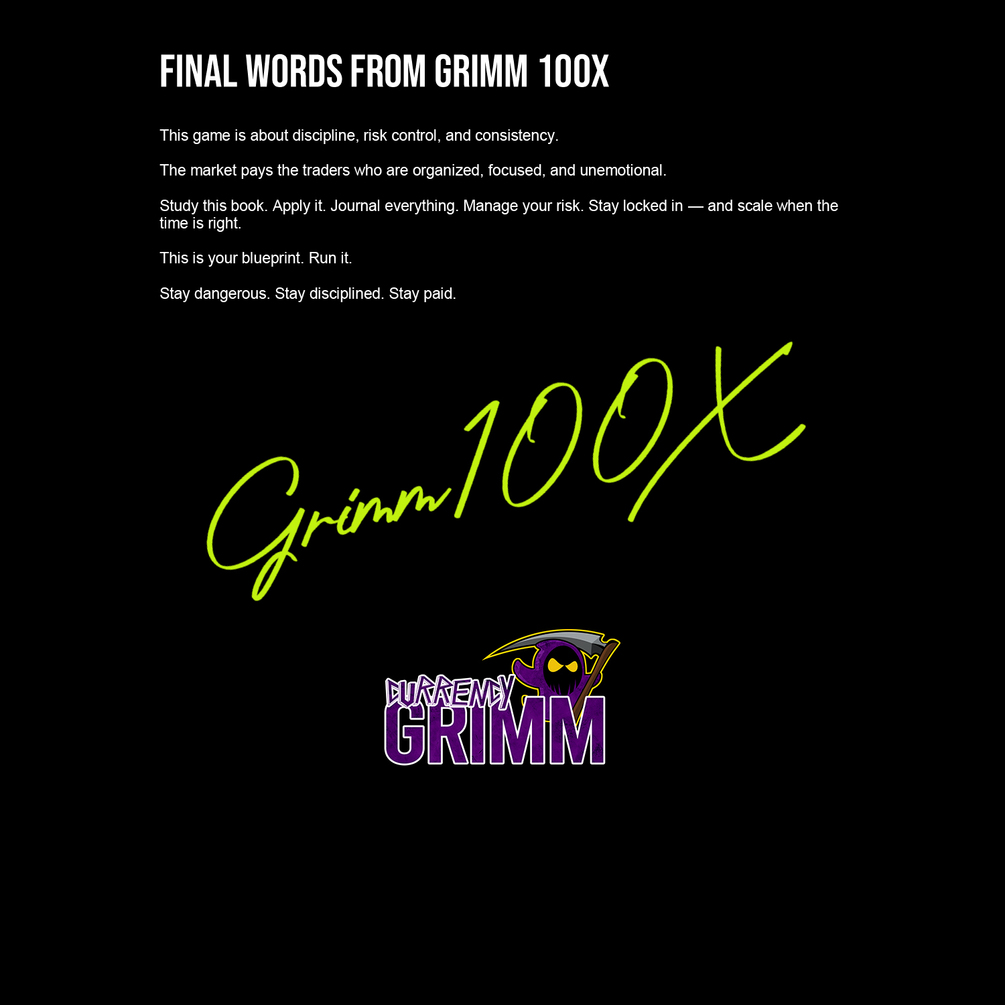- The Grimm 100X Trading Journal – Log your trades like a pro. Review, improve, and stay disciplined. Includes lot size calculators, pip calculators, and trade review templates.